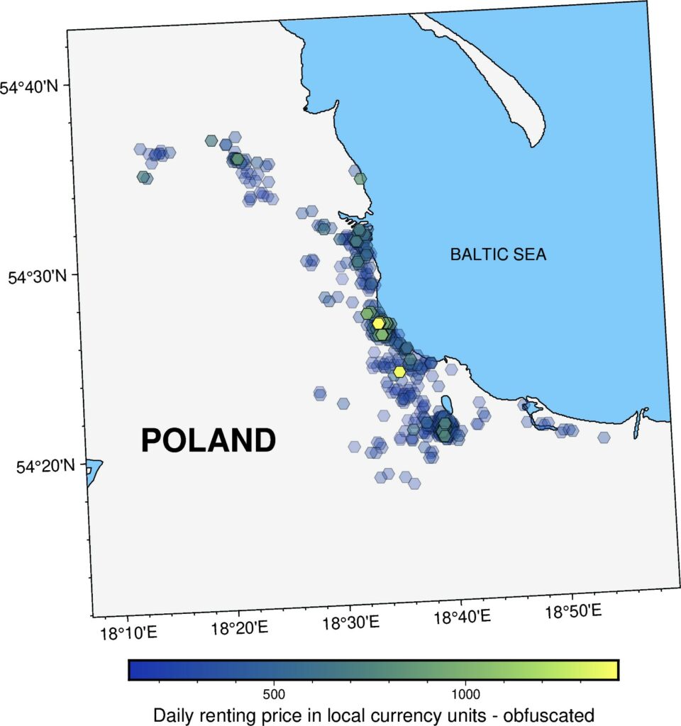 The spatial distribution of locations is slightly different. It is enough to stop the identification of the exact location. The same applies to pricing. The spatial and statistical properties of prices are close to the baseline dataset. You can perform analytics on this artificial dataset, and build AI models without being anxious about the proprietary data leak.